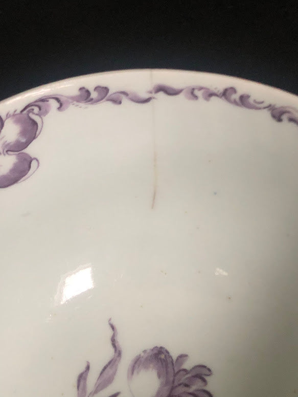 An Extremely Rare Broth and Saucer from Worcester with Large Painted Flowers and Bugs. The Inner rim has nicely painted scrolls and Flower in the center. Unmarked..