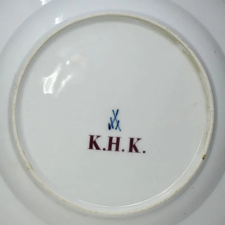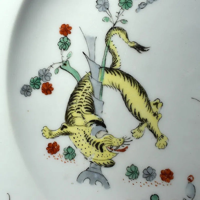 The Kakiemon Pattern shows the Yellow Lion Prowling around Bamboo Shoots and Surrounded by Kakiemon Flowers within a Brown Painted Border. Has the Early Cross Swords, Drehers Marks and K.H.K to the Base.