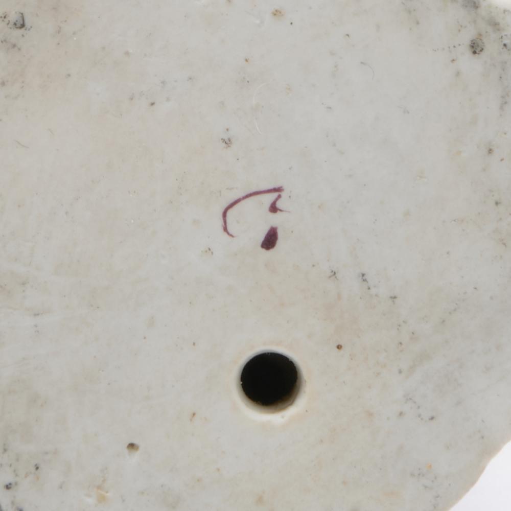 Mercury standing by a tree-stump, wearing a winged helmet and puce cloak and holding a caduceus in his right hand, the base applied with leaves and flowers, has the cross swords to the rear of base and purple letter to the base.