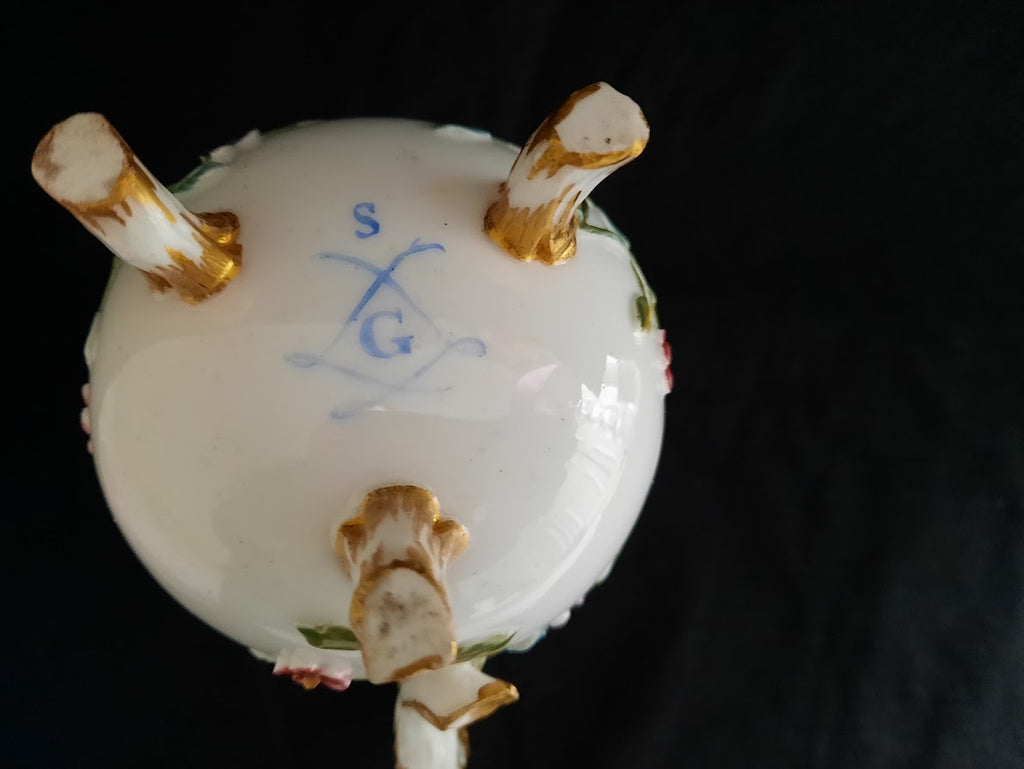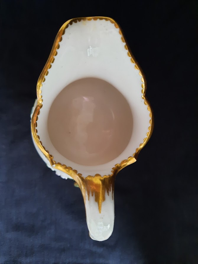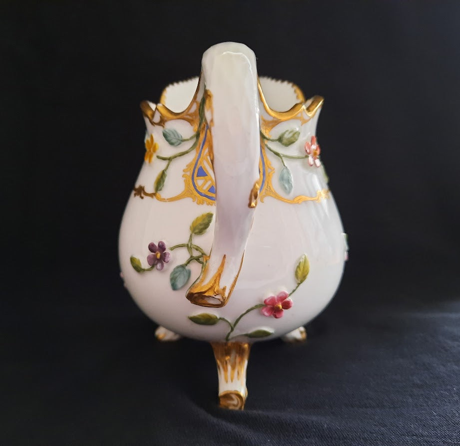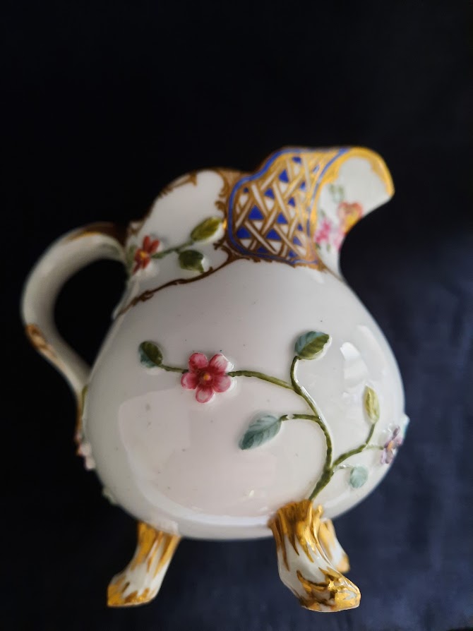 A beautifully painted Milk Jug by Sevres. lovely moulded floral stems coming from the handle and base moving upwards to painted flowers divided by a triangular chequered pattern within cartouches. Has the factory mark enclosing the date letter G for 1760 and the painter's mark S for Pierre-Antoine Méreaud (active 1754-91). The pattern of trelliswork decoration was called 'mosaïque' in the Sèvres manufactory's archives. In 1760 Louis XV presented a dinner service of this pattern, painted with birds rather than flowers, to the Elector Palatine which is displayed in the Bayerisches National museum and the Residenz Museum in Munich.