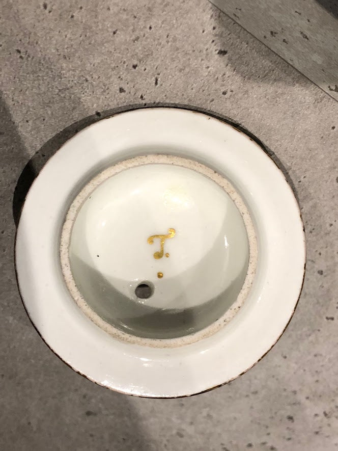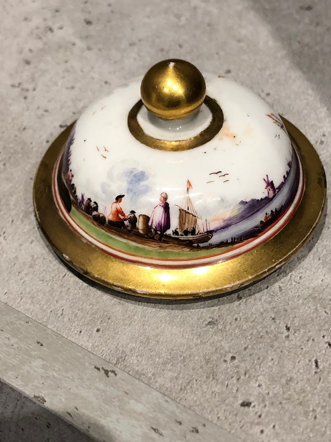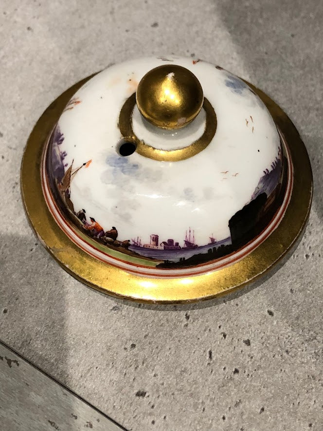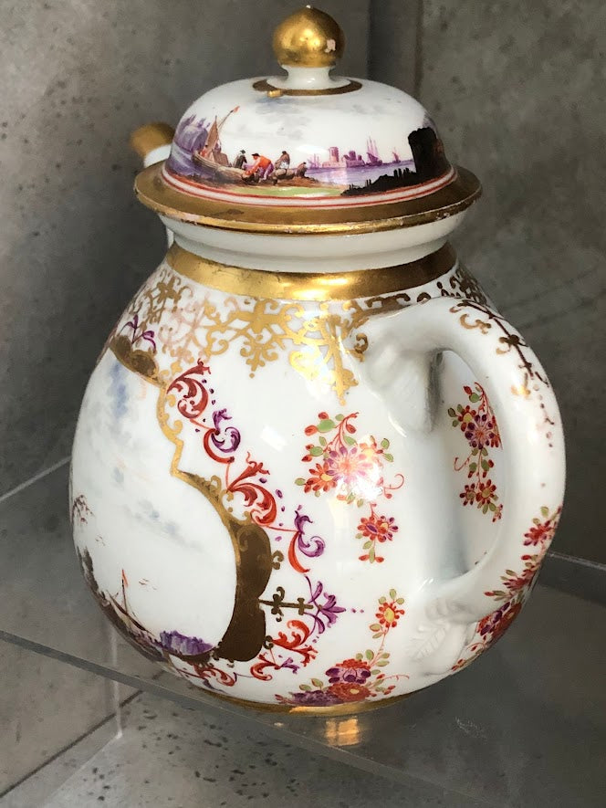 A Nicely painted Teapot of globular form with a curved spout with mask terminal, each side finely painted with a Kauffahrtei scene of merchants and their wares by a quayside, and a river scene, within a gilt scroll- and strapwork cartouche edged with purple and red scrollwork and flanked by indianische Blumen, the mask embellished in gilding and purple, gilt scroll- and strapwork border to the rim, the cover with a continuous harbour scene, Has the Early Meissen Cross Swords, Decorators and Drehers Marks, circa 1730