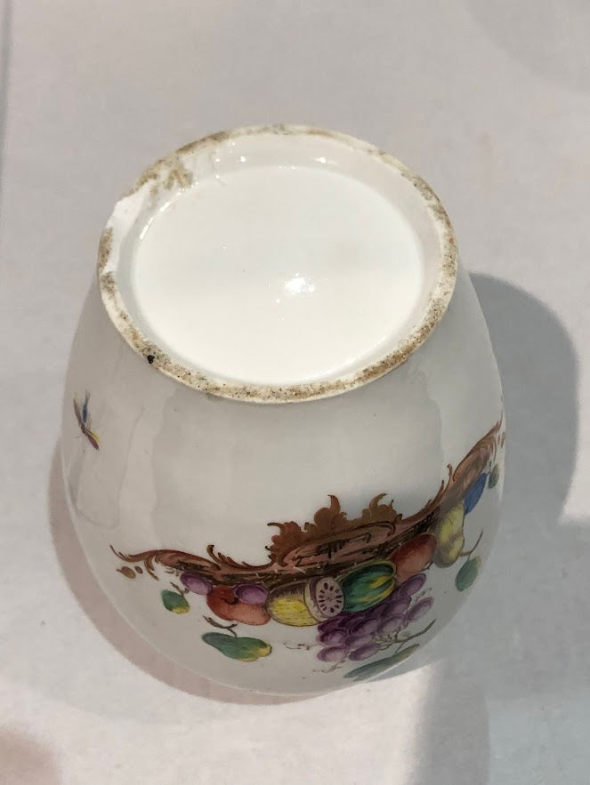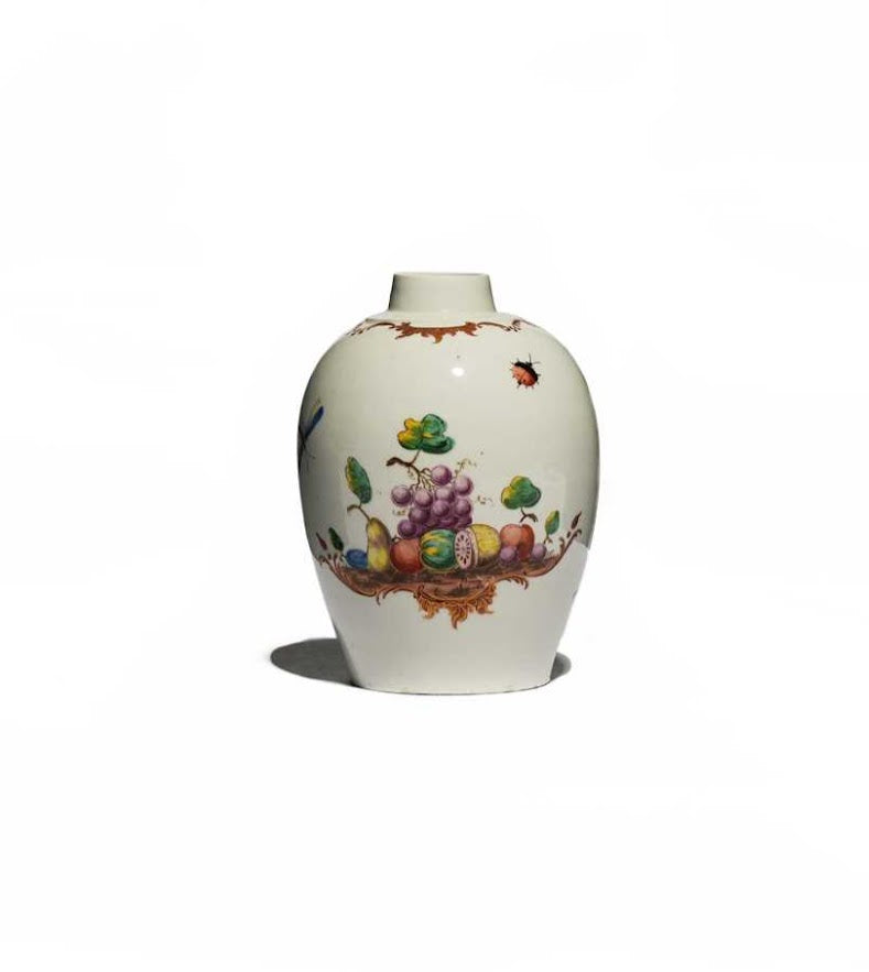 A Nymphenburg tea canister, 1765-.1770, of ovoid form, painted with an arrangement of fruit including grapes and a cut lemon, with ladybirds and other flying insects around, the shoulders with a gilt and red scroll motif, impressed shield mark and letters to the base rim.