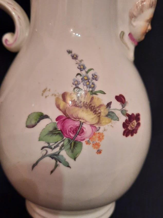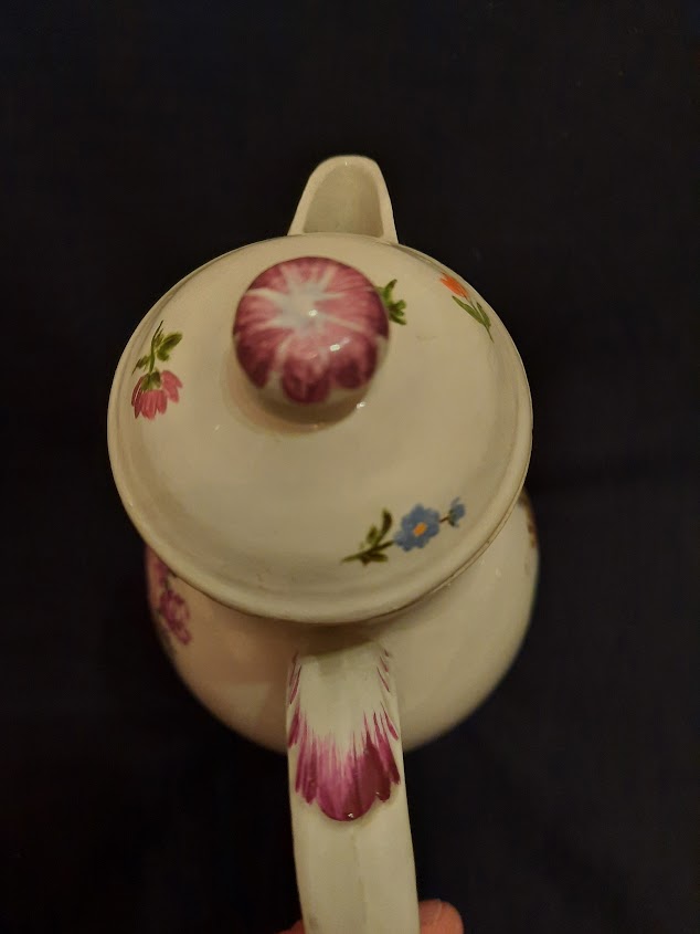 Ansbach Coffee Pot with Various Flowers with masked spout that i love about Ansbach they often have these. Has the Factory A to the Base.. Circa 1760