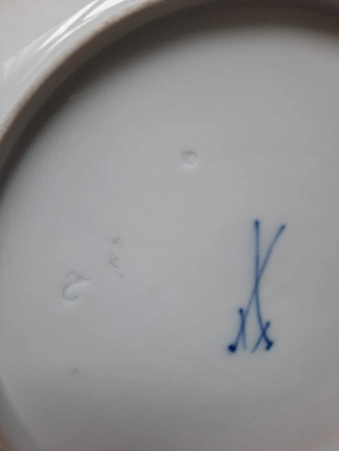 A nicely painted with two birds perched on a low branch with a colourful moths and other flying insects around, within an osier moulded rim, Has the Meissen crossed swords to the base.